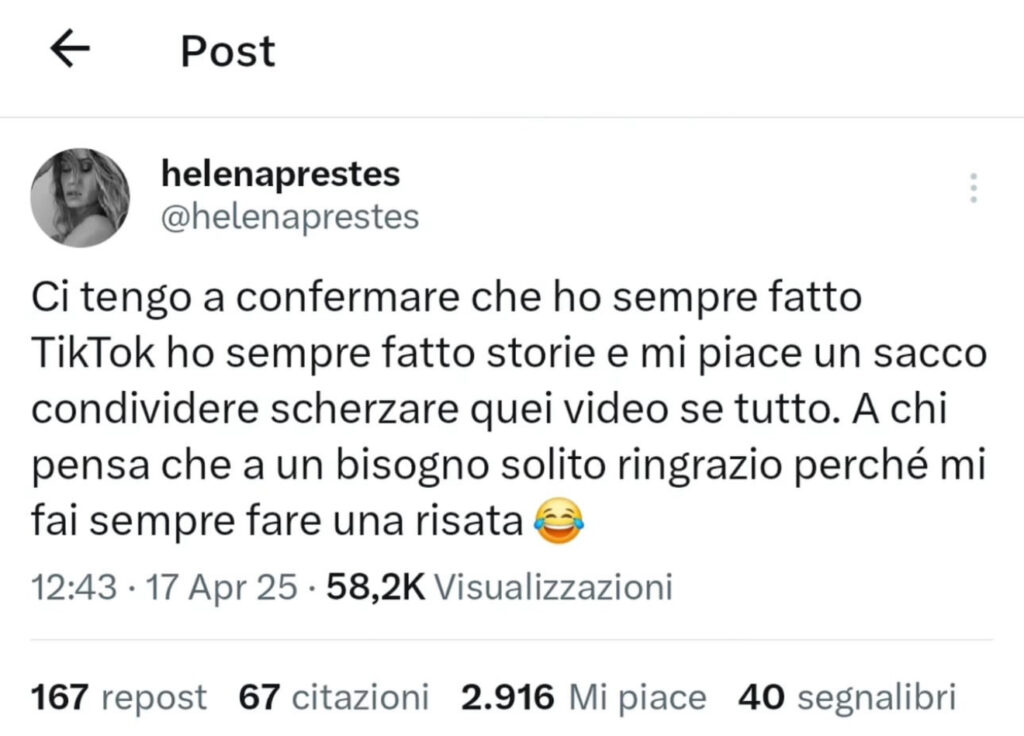 Tante persone vogliono vederci, vogliono condividere con noi la nostra vita. Di questo siamo contenti. Lo faremo sicuramente, anche se all’inizio ci siamo presi, come vi ho detto, un po’ di tempo per noi. Ma nasce in realtà in automatico. Io credo che chi fa il contrario forse perché tra di loro non stanno bene. Noi stiamo benissimo quindi non abbiamo bisogno di fare la storia, il video, i TikTok. Stiamo troppo bene.